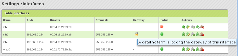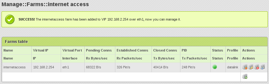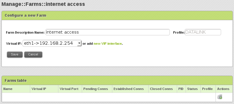 Il est maintenant temps de créer une nouvelle ferme de liaisons de données en utilisant l'interface à laquelle les clients demanderont les connexions sortantes à Internet (pour cet exemple, eth1), via la section Manage :: Farms.