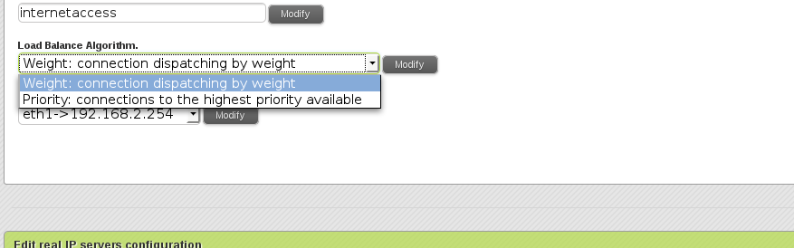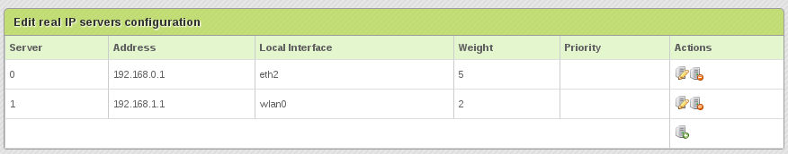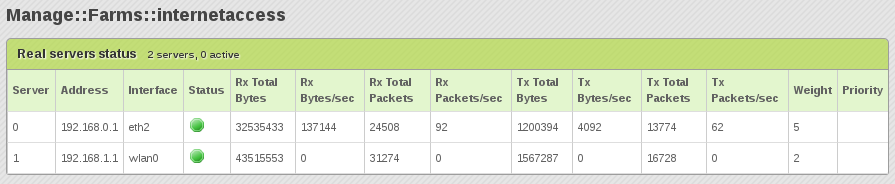 Enfin, nous devons configurer nos backends. Pour l'équilibrage de charge des liaisons montantes, les vrais serveurs seront les routeurs qui fournissent l'accès réel à Internet avec l'interface et le poids ou la valeur de priorité correspondants.