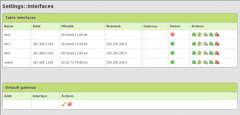 L'illustration suivante montre la configuration des interfaces réseau via la section Paramètres :: Interfaces. Notez que nous n'avons besoin d'aucune passerelle configurée, car la communication se fait directement avec les routeurs.