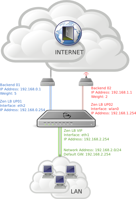 Le dessin ci-dessous est un exemple d'architecture pour l'équilibrage de charge des liaisons montantes, où nous avons utilisé une appliance Zen Load Balancer comme passerelle par défaut pour les clients.